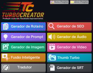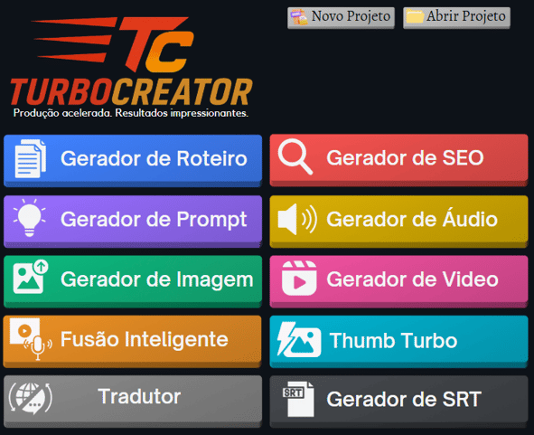 O Turbo Creator é muito mais que um software. É um hub completo de criação de conteúdo — uma central com ferramentas integradas que trabalham juntas para transformar ideias em vídeos com áudios integrados